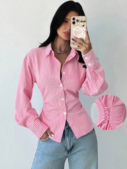 Détail principal : Le laçage dans le dos (visible dans le petit médaillon de l’image) qui permet de resserrer la taille et de créer une silhouette ajustée.